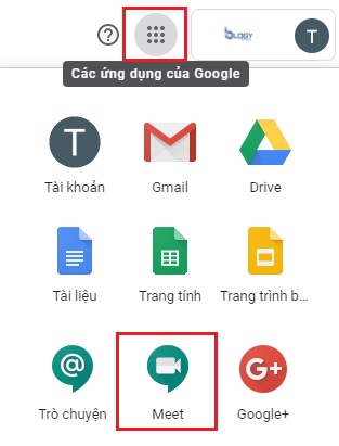 - Bước 1: Đăng nhập vào tài khoản Gmail G Suite, bấm vào biểu tượng Các ứng dụng của Google chọn Meet