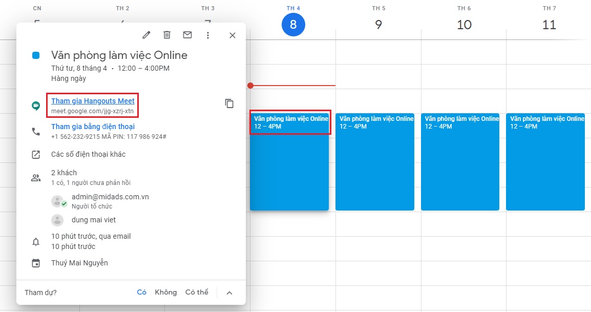 - Tạo phòng họp công cụ Lịch (Calendar): Cách này giống như việc chúng ta tạo 1 Văn Phòng Làm Việc hoặc Phòng họp ảo trên hệ thống, người sử dụng có thể tham gia bất kỳ lúc nào