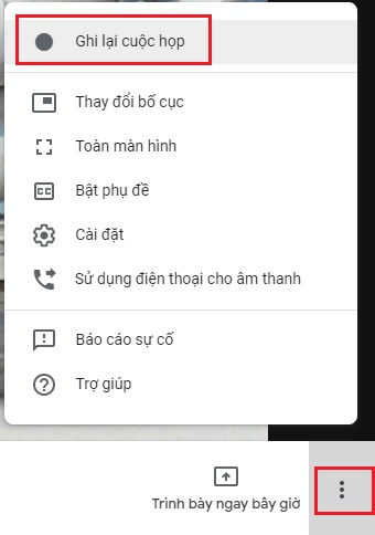 - Để Ghi hình cuộc họp chọn nút Tùy chọn và chọn Ghi lại cuộc họp để ghi (file video sẽ được lưu trên Google Drive và hệ thống sẽ có email thông báo tên file cho người ghi hình), khi muốn kết thúc ghi hình chọn Tùy chọn và chọn Dừng ghi