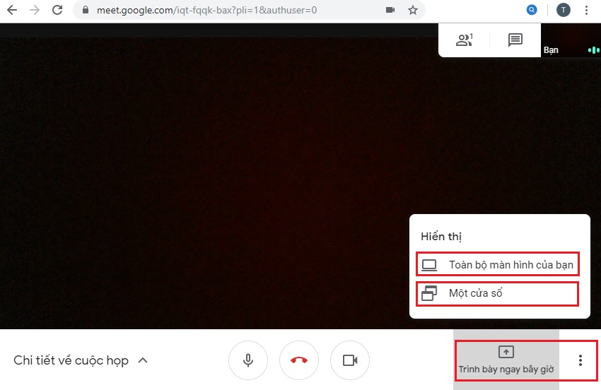 - Bấm Trình bày ngay bây giờ, trong mục Hiển thị bấm chọn Toàn bộ màn hình của bạn, hoặc Một cửa sổ