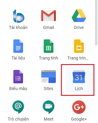 - Bước 1: Đăng nhập vào tài khoản Gmail G Suite, bấm vào biểu tượng Các ứng dụng của Google chọn Lịch